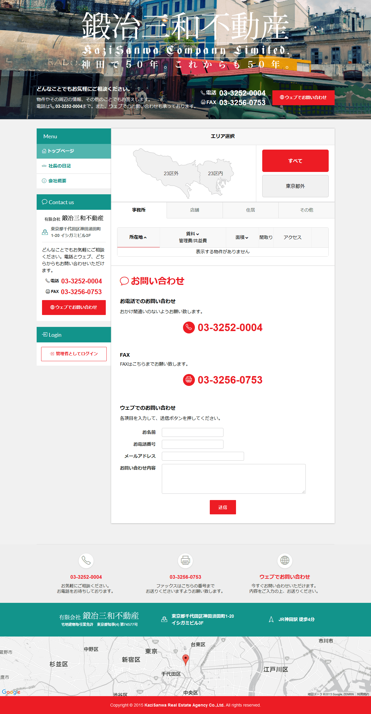 神田で50年営む不動産のウェブサイト。「ウェブ上に管理物件を登録し、お客様にウェブサイトを使って物件を紹介したい」というご要望から、物件の管理システム、間取りや写真を掲載した物件紹介ページを取り入れたウェブサイトを制作しました。その他に、ウェブサイトでお客様と交流できるようにブログも設置しました。